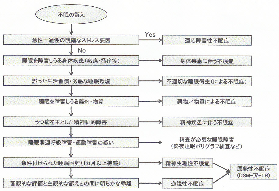 一過性の過度なストレスによる影響がないか、疼痛などのために不眠が生じていないか、生活習慣の乱れがないか、薬剤の影響、精神疾患の影響、睡眠関連呼吸障害・運動障害の存在の有無などの除外が必要である。