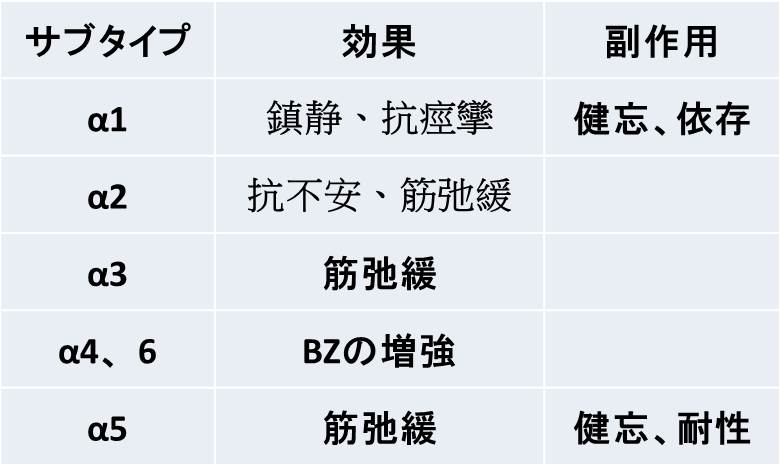 BZP系薬剤はω1ω2に作用し、Z drugはω1に作用するとされている。