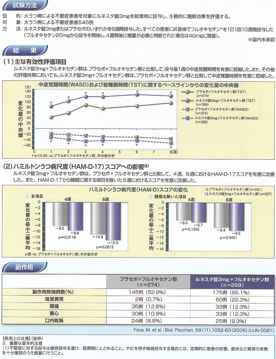 うつ病症例においてルネスタを追加投与した際に、中途覚醒やそう睡眠時間の改善効果のみでなく、ハミルトンうつ病尺度スコアでの改善効果を認めている。
