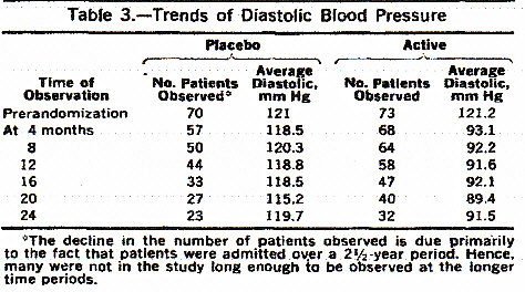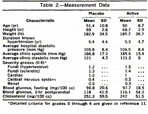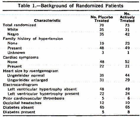 拡張期血圧が115~129mmHgである143名の男性に対して、hydrocholorothiazideにreserpine、hydralazine hydrochlorideを投与した群と何も投与しなかった群で検討された。患者背景を示すが、このころはWhite、Negroと表記されている環境であった。