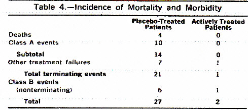 プラセボ群では死亡4例を含む27例にMorbid eventが生じたが、治療群では、死亡例もなく、Morbid eventは2例にしか生じなかった。