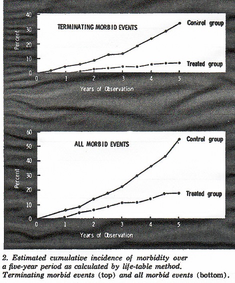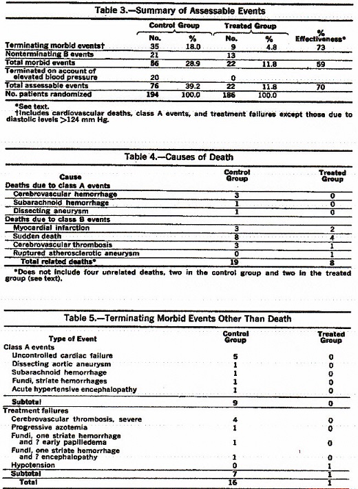 もう少し血圧が引く人たちでの結果が1970年に報告された。拡張期血圧が90-114mmHgの380例の男性を治療群とプラセボ群分けた研究である。プラセボ群では19例の死亡を含むTerminating morbid eventsは35例に認めたのに対し、治療群では8例の死亡を含むTerminating morbid eventsは9例であり、73%の減少効果を認めた。