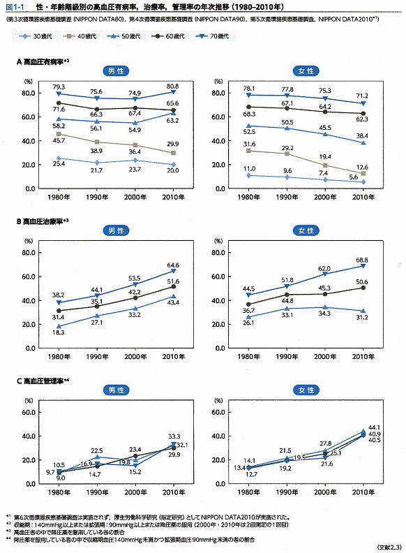 高血圧の治療率は上昇しており、60歳代で50%を超えてきたが、140/90未満に管理されている率は、男性で30%、女性で40%程度である。