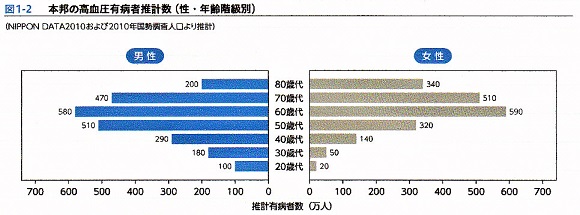 NIPPON DATA2010における高血圧有病率から、本邦における2010年の高血圧有病者数は4300万人(男性2300万人、女性2000万人)と推計されている。女性では各年齢階級で減少傾向にあるが、男性の50歳以上では横ばいあるいは上昇傾向である可能性があり、人口の高齢化に伴い、高血圧有病者数はさらに増加することが予想される。