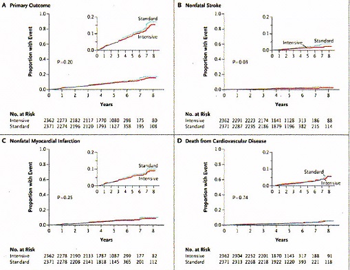 2型糖尿病患者への積極的な治療効果を見たACCORD BP研究で血圧を120前後に下げたIntensive群と135前後で推移したStandard群で8年間の経過観察では心血管イベントの発症に差はなかった。