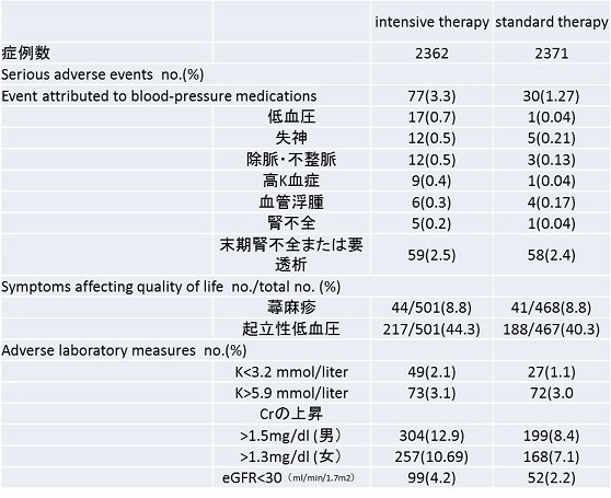 しかし、副作用は、Standard群に比べ、Intensive群で2倍以上に認めたため、米国やヨーロッパにおいての高血圧治療ガイドラインは軒並み140/90となってしまった。