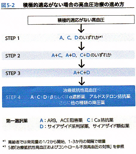 今回から治療の第一選択薬からβブロッカーがなくなり、第一選択薬のARBまたはACE阻害薬、カルシウムブロッカー、利尿剤から選び、効果が不十分であればそれの二剤を、次いで3剤の併用用法を行い、その次に、βブロッカーの使用が推奨されている。