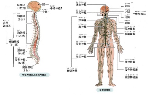 末梢神経は12対の脳神経、脊髄神経、頸神経叢、腕神経叢、腰神経叢、仙骨神経叢、陰部神経叢に分けて考えることができる。