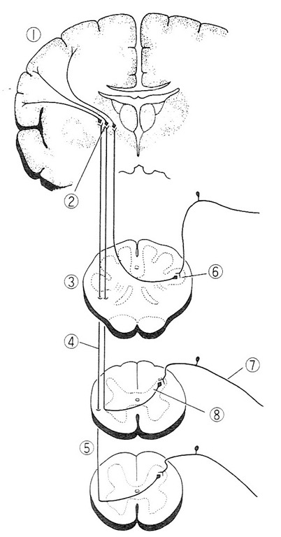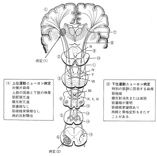 ①皮質運動野、②中脳、③橋、④上部延髄、⑤下部延髄、⑥脊髄、⑦内包、⑧錐体路、⑨皮質中脳路、⑩大脳脚、⑪皮質延髄路、⑫錐体、⑬錐体路、⑭錐体交叉、⑮外側皮質脊髄路