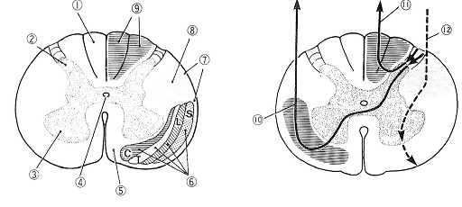 ①索路、②後角、③前角、④中心管、⑤錐体前索路、⑥脊髄視床路、⑦小脳側索路、⑧錐体側索路、⑨後索路、⑩前側索路、⑪後索路、⑫錐体路