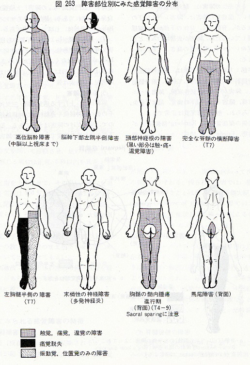 シビレなどの感覚障害を見るときには、温・痛覚(表在感覚)の障害か、触覚・深部感覚の障害か? 両側性か片側性か? 左右対称性か、非対称性か? を診る。