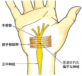 手根管症候群(Carpal Tunnel Syndrome:CTS):正中神経が手首(手関節)にある手根管というトンネルで圧迫されて生じる病態で、手指の痺れ、痛みが出現し、時には運動障害も出てくる。