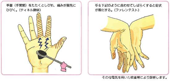 Tinel徴候:手首を打腱器などでたたくとシビレと痛みが指先に響く兆候。