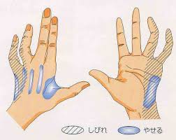 痛みは明け方に強く(夜間から)目を覚ますと手がシビレ、痛む。手を振ったり(Flick sing)、指を曲げ伸ばしすると、シビレや痛みは楽になる。手のこわばり感をして訴えることもある。ひどくなると母指球が痩せてきて、OKサインができなくなる。縫物がしづらくなったり、細かいものがつまめなくなる。