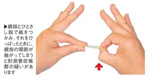 左右の母指と指示で紙を引っ張り合うと、母指内転筋の麻痺があるために母指は屈曲する。