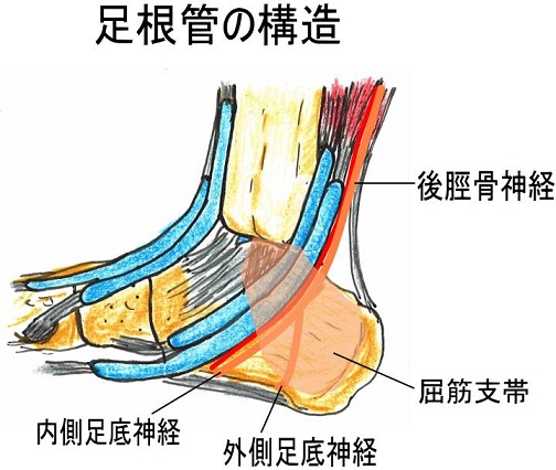 脛骨神経は坐骨神経の分岐で膝窩から内果と屈筋支帯との間(足根管)を通り、足底に達し、内側と外側の足底神経に分かれる。足首で後脛骨神経や、内側足底神経、外側足底神経が圧迫され、足の裏がしびれてくる。