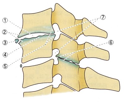 ①椎間間隙狭窄、②前方骨棘、③前縦靭帯骨化、④椎体縁骨硬化、⑤後方骨棘、⑥椎間関節骨棘、⑦椎間孔狭窄