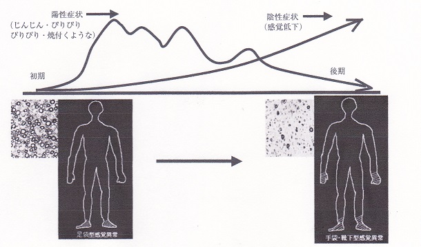 糖尿病神経症状の経過である。糖尿病性多発ニューロパチーは感覚神経障害優位で足関節を超えて近位に広がることは少ない。足趾や足底部のシビレや疼痛などで発症し、足足袋型を呈する。後期になると、感覚低下が出現し、手袋靴下型の感覚異常を呈するようになる。