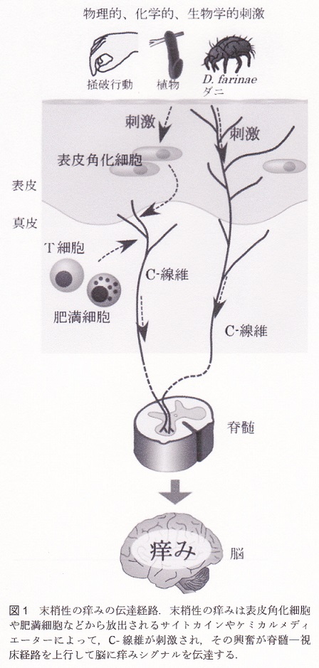 末梢性の痒みは、表皮真皮境界部に分布するC線維神経終末が機械的、科学的、物理的刺激など外部から刺激を受けて興奮したシグナルを、脊髄、脊髄視床路、視床を経由して大脳皮質感覚野に投射され認識される。