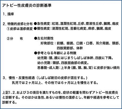 日本皮膚科学会は「アトピー性皮膚炎の定義、診断基準」で、アトピー性皮膚炎とは、『増悪、寛解を繰り返す、掻痒のある湿疹を主病変とする疾患であり、患者の多くはアトピー素因を持つ』としている。