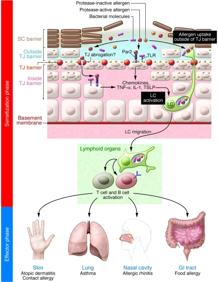 FLG変異がありフィラグリンが形成されないと、角層バリア機能不全が生じる。通常では侵入してこないアレルゲンが、容易に角層に入り込み,抗原提示細胞により貪食され、提示された抗原により感作が成立し、アトピー性皮膚炎へと進展していく。