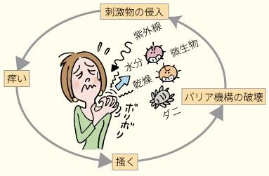 バリア機構の破壊があり、刺激物が侵入し、かゆみが生じ、掻くことにより炎症が生じ、よりかゆみが持続し、掻くことによりストレス解消と認識するようになってしまい、嗜癖的掻破が行われることになる。