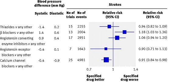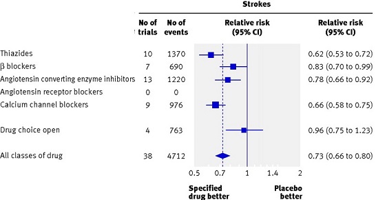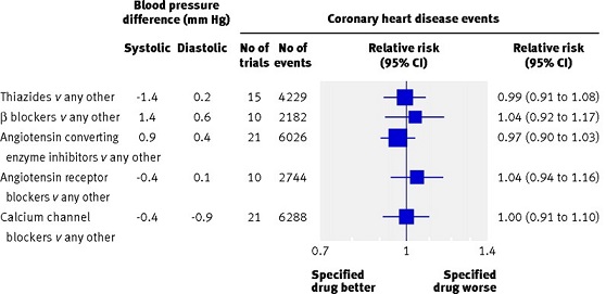 サイアザイド系利尿剤、βブロッカー、ACEI、ARBとカルシウム拮抗薬の間では大きな差はなかった(脳卒中においてはβブロッカーの効果が弱かった)。