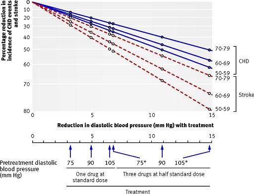 50-59、60-69,70-79歳の三群において、標準的な量での単剤の治療と、3種類の標準投与量の半量の併用投与での治療の比較である。併用投与のほうが拡張期で75mmHg、90mmHg、105mmHg 、収縮期で120mmHg、150mmHg、180mmHgそれぞれにおいてよりイベント抑制効果を認めている。