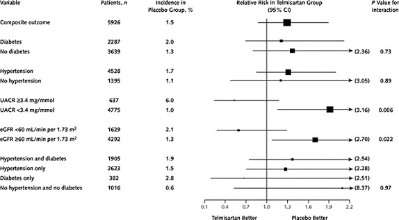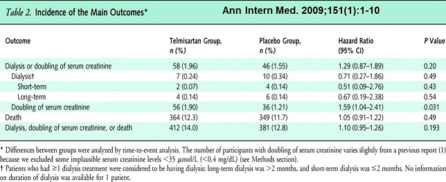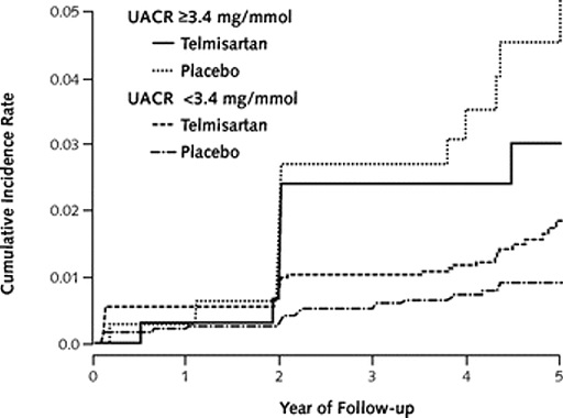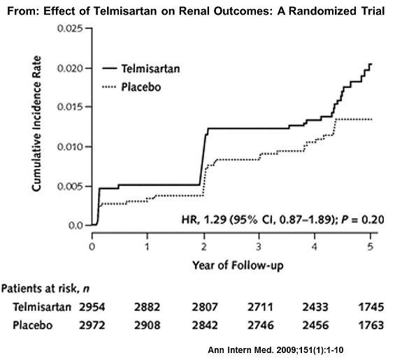 マクロアルブミン尿がなく、心不全がない心血管患者や糖尿病患者5927人に対して、Telmisartan 80㎎投与2954人と、プラセボ投与の2972人を平均56ヶ月治療して検討した研究がある。論文では、あまり重要な差はなかったとしているが、透析移行例や血清クレアチニンが値倍増した症例は、Telmisartan 58例(1.96%)に対し、プラセボ46例(1.55%)であった。