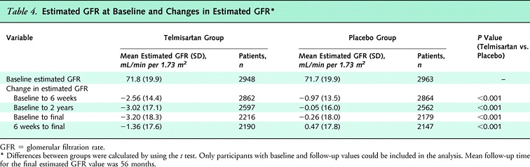 追跡期間中の推定GFRは明らかにTelmisartanにおいて低下が大きかった。