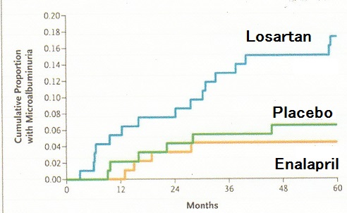 正常域の血圧でアルブミン尿を認めない1型糖尿病患者においてACEIのEnalapril(20㎎/日)とARBのRosartan(100㎎/日)、プラセボでの比較試験がある。90%の患者で腎生検を行っている。5年間の経過観察においてプラセボ群6%とEnalapril群4%においては差を認めなかったが、Losartan群においては17%と明らかに微量アルブミン尿の症例が増加していた。(網膜症においてはプラセボ群よりも治療両群において有意に悪化が減少。)腎機能が悪くない、アルブミン尿を認めない症例においてARBを使用することは一考を要するかもしれない。