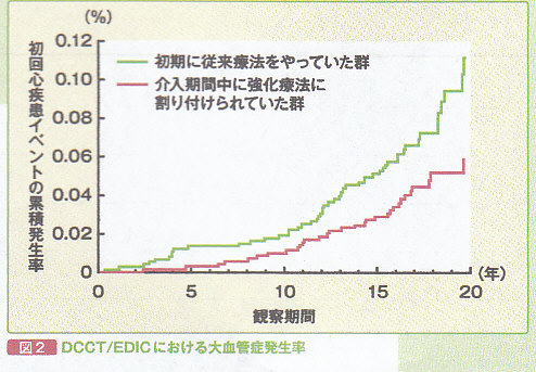 DCCT研究で1441人の一型糖尿病患者に6.5年の強化療法を行った後、22年間の経過で、腎機能の悪化の危険度を50%減少させることができたとしている。