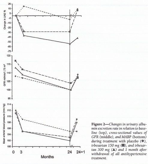 微量蛋白尿を認める2型糖尿病患者にACEIの一つであるIrbesartanを投与した際の尿中のアルブミン量とGFR,血圧の変化を見てみると、血圧の低下でタンパク尿は減少するが、投与を中止し、血圧が上昇うると再度尿中微量アルブミン量は増加する。