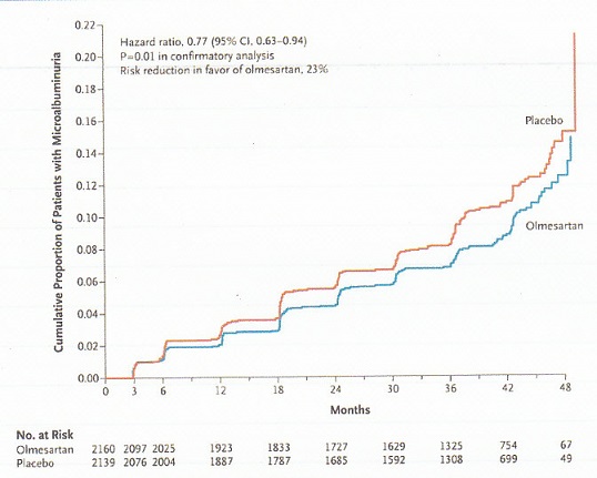 ARBの一つであるOlmesartanとそれ以外の薬剤で130/80以下に血圧を下げた(80%の症例で達成)際の微量アルブミン尿の変化を見てみた。微量アルブミン尿の発現した患者の頻度は、Olmesartan群で8.2%、プラセボ群で9.8%であり、微量アルブミン尿発現までの時間が23%延長した。