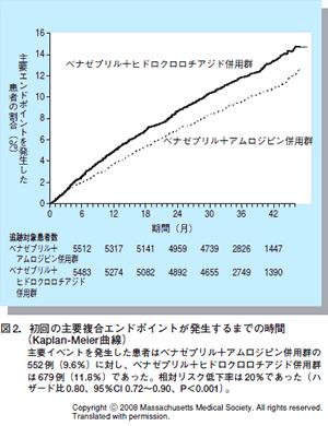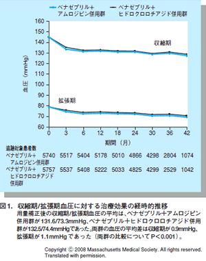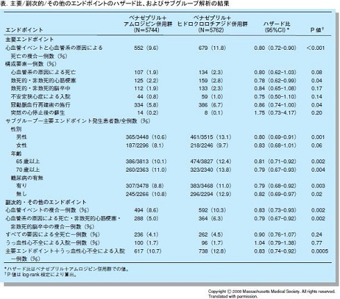 収縮期血圧160mmHg以上または降圧治療中でハイリスク群(心血管疾患、腎疾患、臓器障害既往者)1万1506例をACEIであるベナゼプリルとアムロジピンの治療群(B+A群)とチバセンとヒドロクロロチアジド治療群(B+H群)に分けて、心血管複合イベント抑制効果を比較した試験がある。