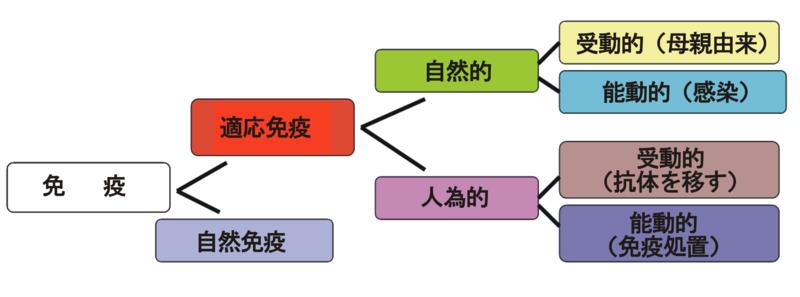 免疫を分類すると、生まれた時から持っている自然免疫と、成長の過程で獲得する適応免疫に分けられる。自然に獲得する方法としては、母親からもらいうける受動的免疫と、成長過程で観戦して獲得する能動免疫に分けられる。人為的に摂取する方法としては、抗体を体に入れる受動的免疫と、ワクチンを接種して獲得する能動的免疫に分けることもできる。