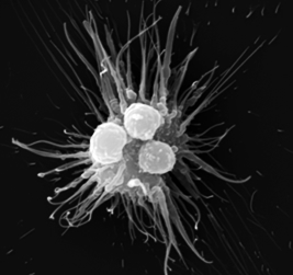 (DCとT細胞:ウニのような突起を出した大きな細胞の上に3つの丸い小さなリンパ球が付着しているところを走査電子顕微鏡で撮影)