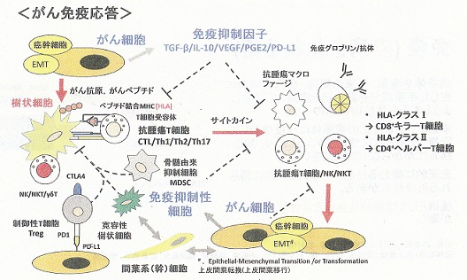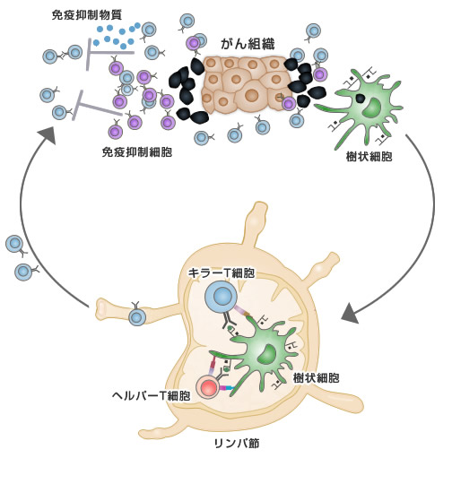 ガン細胞に対する免疫応答としては、ガン細胞の成分を樹状細胞が貪食し、抗原提示を行い、T細胞やB細胞を活性化するが、生体においては、免疫抑制因子や免疫抑制細胞が働き、ガン細胞を保護するような働きもある。