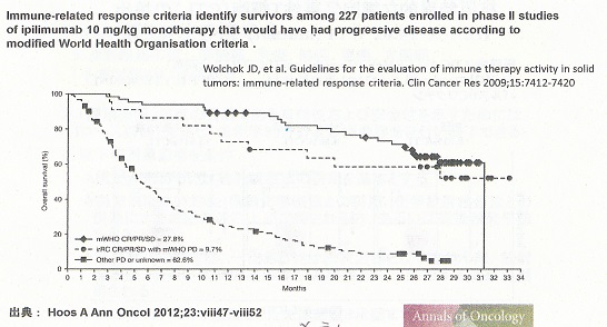生存曲線は、通常は50%の人が生存できる期間:MDSで評価して、この期間が延びることにより評価されるが、免疫療法は、記憶される治療の意義は、この後のdelayed separationが伸びてくることで評価される。