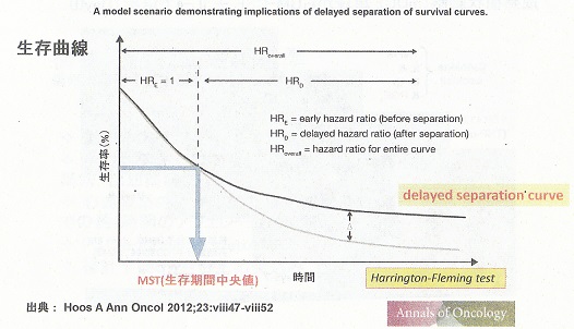 → 遅延効果があるため、Logrank testのように観察期間を通じてHazard ratioが一定という仮定がおけない。当初のうちはHR=1であり、以後HRが1以下に変化する(delayed separation of curveが起こる)。この統計解析にはHarrington-Fleming法が必要、