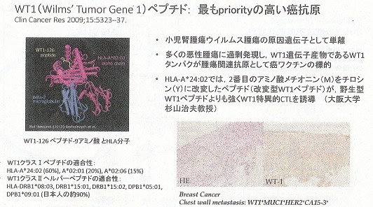 標的にする癌抗原の代表で、WT1というものがある。もともとは子供の腎細胞ガンで見つかったが、いろいろなガン細胞でも発現されている。二番目のアミノ酸を改変したものをガン抗原として認識させる。