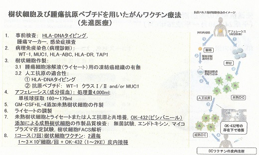成分採血をして、1週間で樹状細胞を作製し、2週間で全身検査を行い、2週間ごとに7回投与を行う。