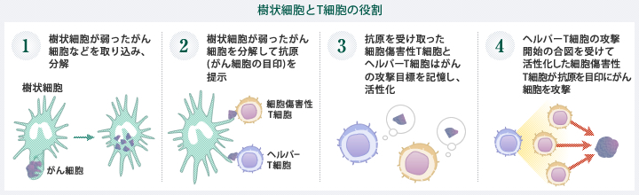 樹状細胞がガン細胞を取り込み分解し、抗原を提示して、その抗原を受け取った細胞障害性T細胞とヘルパーT細胞は、ガンの攻撃目標を記憶して活性化される。ヘルパーT細胞の攻撃開始合図を受けて活性化した細胞障害性T細胞が管抗原を目印にガン細胞を攻撃することになる。