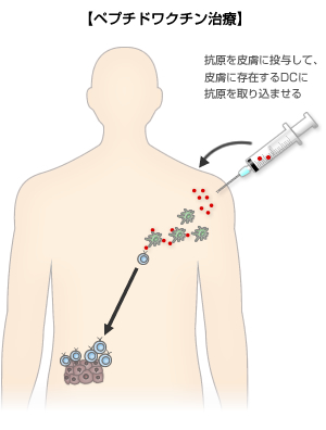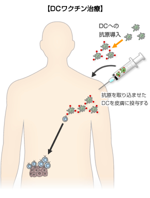 ガン抗原が同定されていてガンの蛋白質由来のペプチドが利用可能であったり、手術などで摘出した腫瘍組織から腫瘍抗原溶解液(ライセート)を作成ができれば、これらのペプチドやライセートを抗原として投与することにより、ガンに対する抗原特異的な細胞障害性T細胞(CTL)を誘導できる。このような樹状細胞を皮内や静脈に投与し、体内の主要特異的免疫反応を惹起させ、ガン細胞のみを殺傷しようとする治療法を樹状細胞ワクチン治療という。
