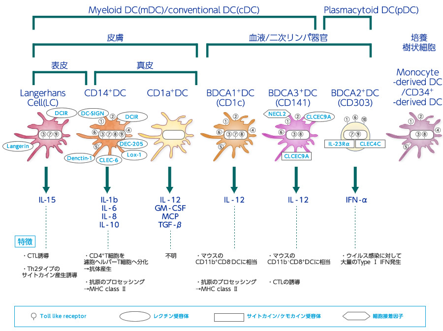 mDC/cDCの局在は皮膚と血液/二次リンパ器官に分けられる。皮膚cDCは表皮のランゲルハンス細胞(LC)と真皮に存在するCD14+DCとCD1a+DCの三つのサブセットに区別される。