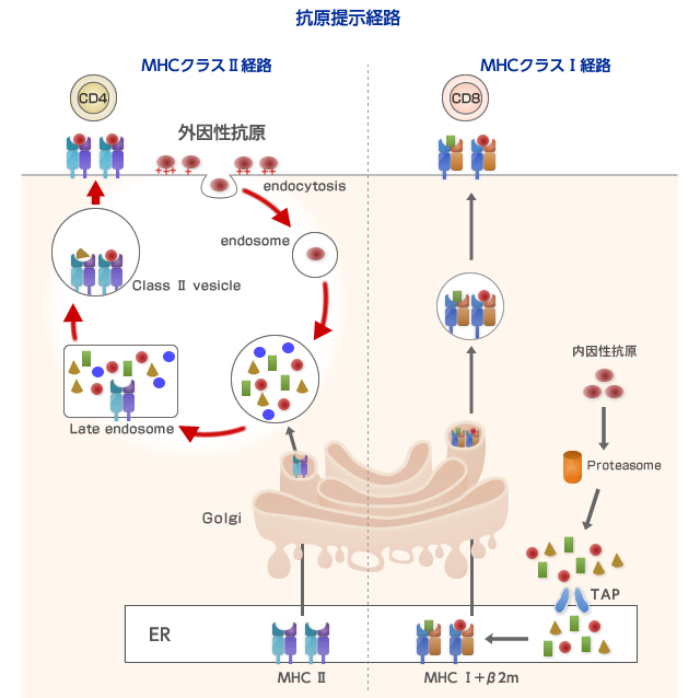 一方エンドサイトーシスによって取り込まれた細胞外に存在する外因性抗原は、エンドソーム内で分解され、MHCクラスⅡ分子に結合し、MHCクラスⅡ/ペプチド複合体は、細胞表面でCD4陽性T細胞に抗原提示される。