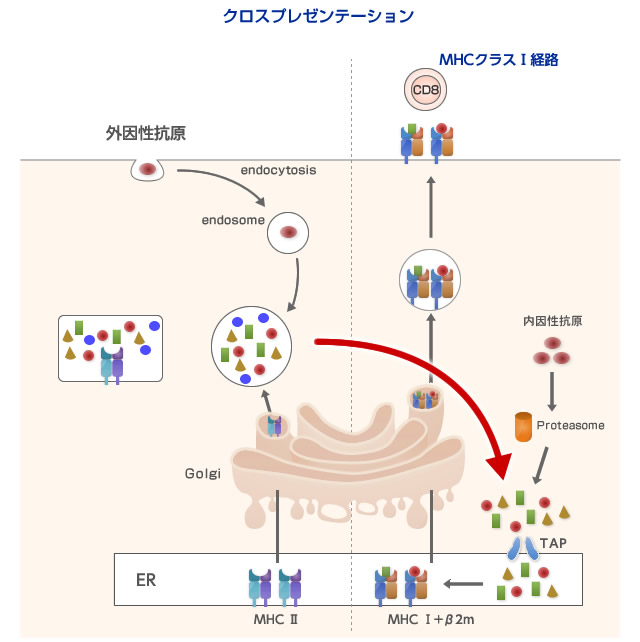 細胞外から取り込んだ外因性抗原を抗原提示分子であるMHCクラスⅠ分子に提示する機能はクロスプレゼンテーションと呼ばれ、抗腫瘍免疫において中心的な役割を担っている。