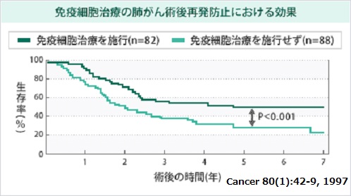 下の図は千葉県がんセンターでの肺がん手術後の免疫細胞治療効果の図で免疫細胞療法を行った82人は5年後も半数以上が生存しているのに対し、併用しなかった88人では1/3程度しか生存せず、免疫細胞療法により、再発・転移および進行の抑制効果があったとされている。