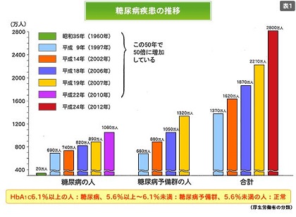 糖尿病及びその疑い患者は1980年代には日本人の100人に一人ぐらいの割合であったが、2010年には6人に一人となっている。1960年からの50年間で50倍にもなっている。これだけ急増した疾患は人類史上他にはない。
