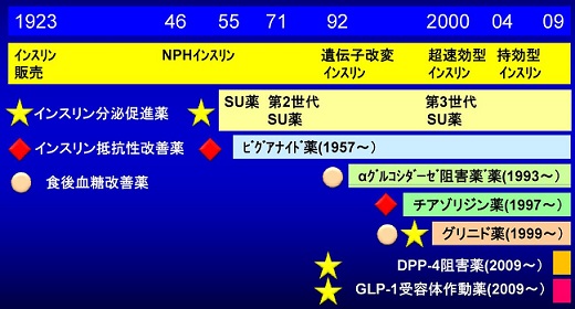 1995年ごろからαGIやチアゾリジン誘導体などが発売され、2010年には、ビグアナイド系が見直され、メトグルコが発売され、翌年インスリン分泌促進薬であるシュアポストも発売された。その後GLP-1受容体作動薬や、DPP-Ⅳ阻害薬、SGLT2(sodium-dependent glucose transporter2)が発売され、治療薬に幅が出てきた。